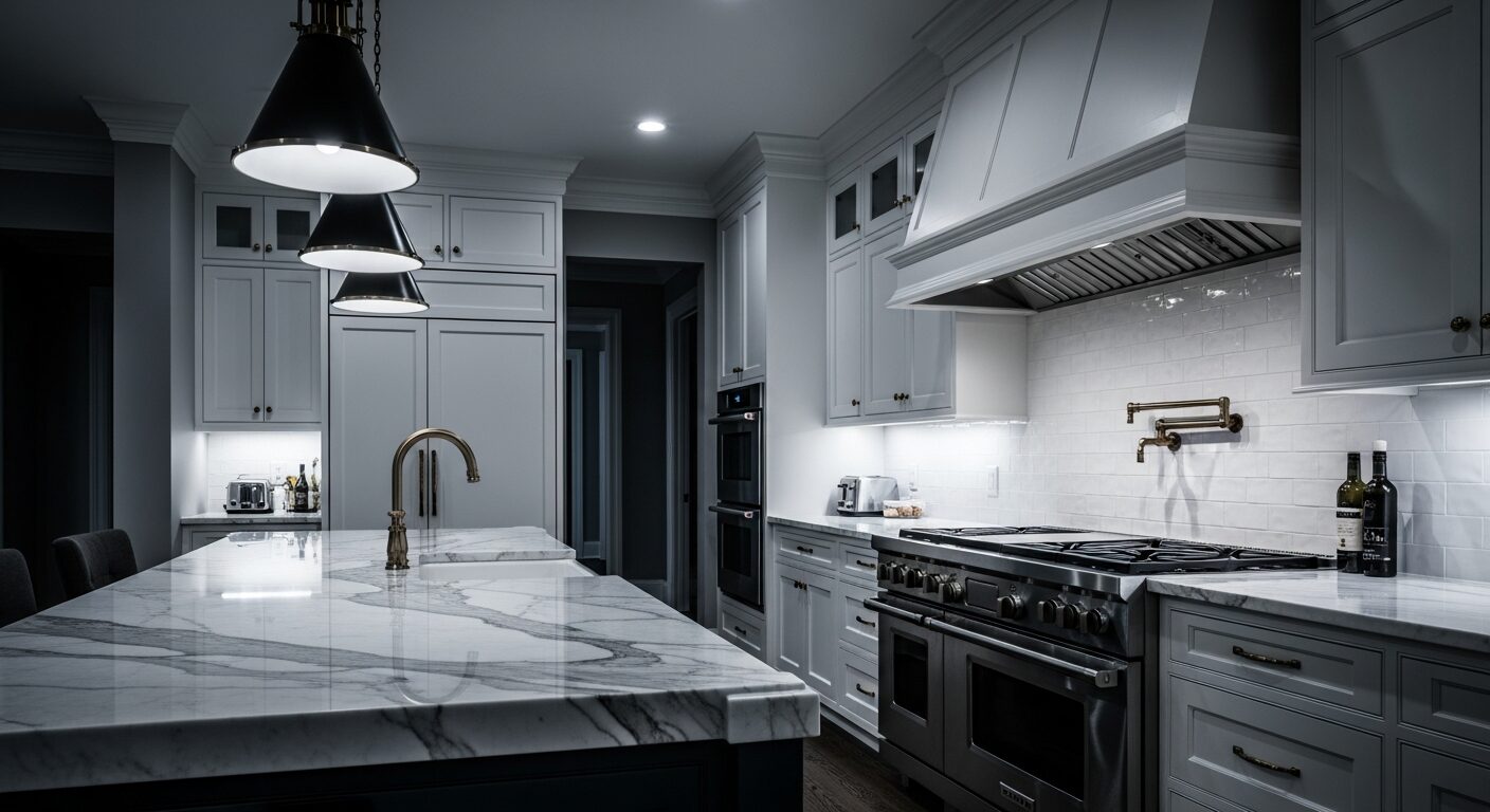 - For kitchen countertops in high-use estate kitchens, we typically recommend non-porous quartzite or engineered quartz — materials that resist etching, staining, and bacterial growth far better than marble. For cabinetry, full-overlay semi-custom or custom cabinet lines in furniture-grade plywood construction outperform particle-board alternatives by decades.
